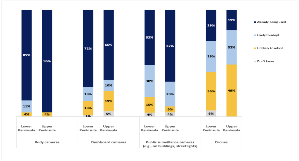 To understand how far the U.P. has come in adopting law enforcement technology, we can look at the change over the past decade. According to local government leaders in the U.P., as shown in Figure 2 below, the adoption of body cameras, dashboard cameras, public surveillance cameras, and drones have increased significantly in the past 10 years. These data come from a survey on criminal justice and policing policies in Michigan that included county officials, as well as officials from cities, villages, and townships that either run their own police departments, share services with another jurisdiction, or contract for law enforcement services provided by a special authority or district, by another municipality, or through a contract with their county sheriff.