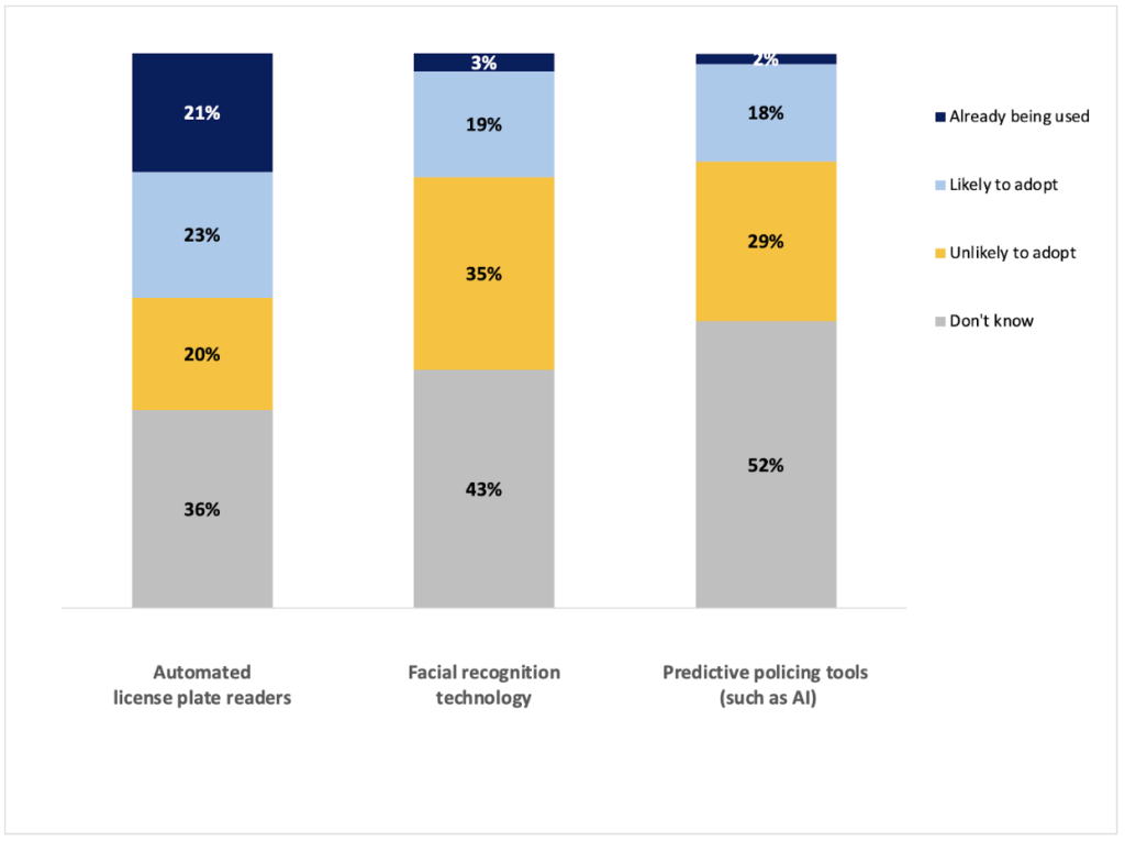 Figure 3 shows responses to newer survey questions that were only asked in 2024, focusing on technologies that weren’t on the radar back in 2015. Here we can see that some communities in the U.P. are already beginning to adopt tools such as automated license plate readers, though usage of facial recognition technology and predictive policing tools are still limited. What stands out to me is the limited use of artificial intelligence (AI). While the results could be different now, a year or so later, I believe that the integration of these tools are necessary.