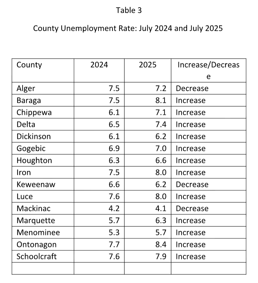 Increases in employment only tell part of the story, since it’s possible for unemployment to also increase if more people enter the labor force and are unable to find jobs, or if the number of unemployed people grows at a faster rate than the labor force. To examine change in unemployment, each county’s July 2024 rate was compared with the corresponding figure in 2025 (Table 3). Only three counties, Alger, Keweenaw and Mackinac, had lower unemployment in July 2025 than in July 2024, while unemployment increased in all the other counties, albeit in some instances ever so slightly.