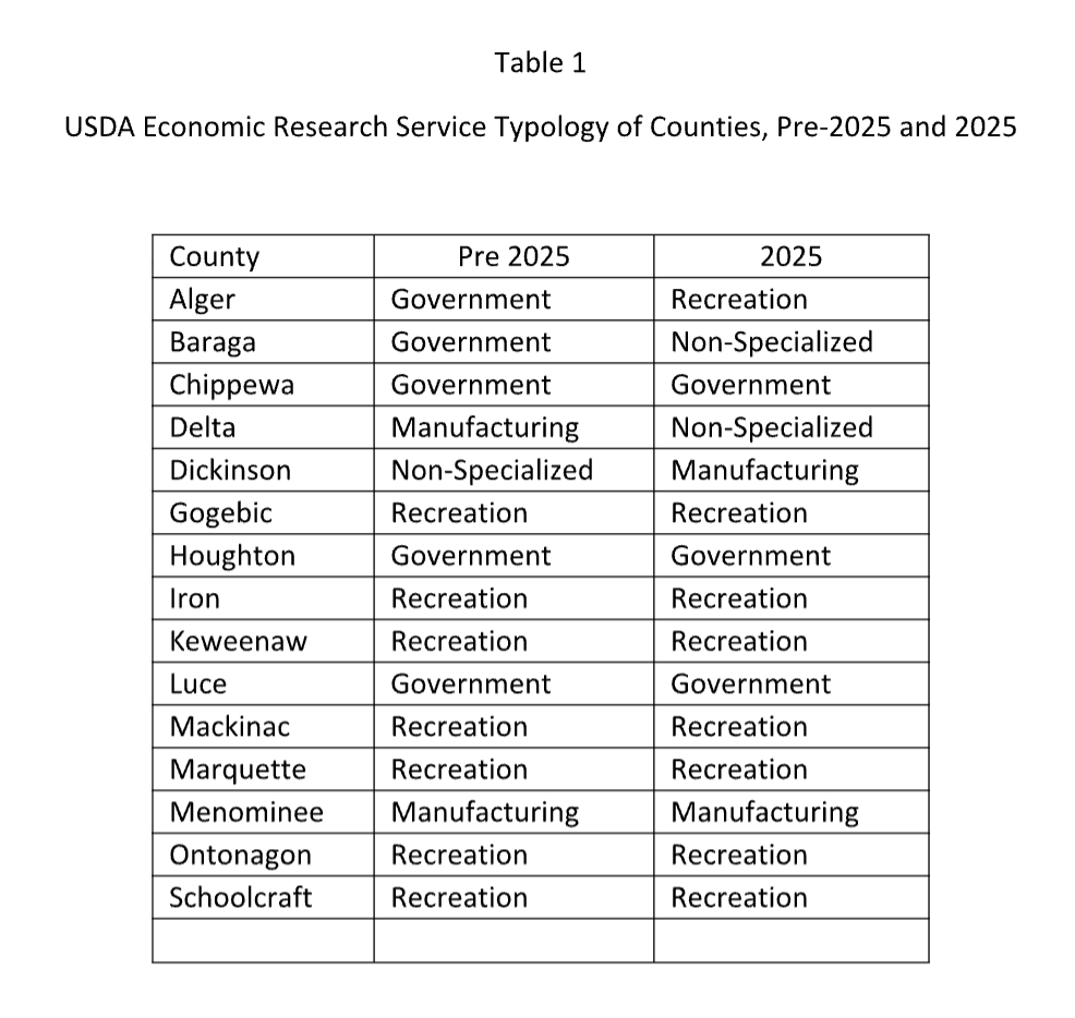 The typology was revised in 2025 to reflect changes in each county’s economy since 2015. Not surprisingly, farming and mining fail to dominate any of the U.P.’s counties, while manufacturing is limited to two counties in each time period. Instead, the service categories of recreation and government dominate the two time periods, with only a few notable changes (Table 1). Alger County switched from government to recreation, which undoubtedly reflects the growth in the area’s tourist economy and the soaring popularity of Pictured Rocks National Lakeshore, while Baraga County in 2025 was reclassified from government to non-specialized. There was no change in Menominee’s classification as a manufacturing county.