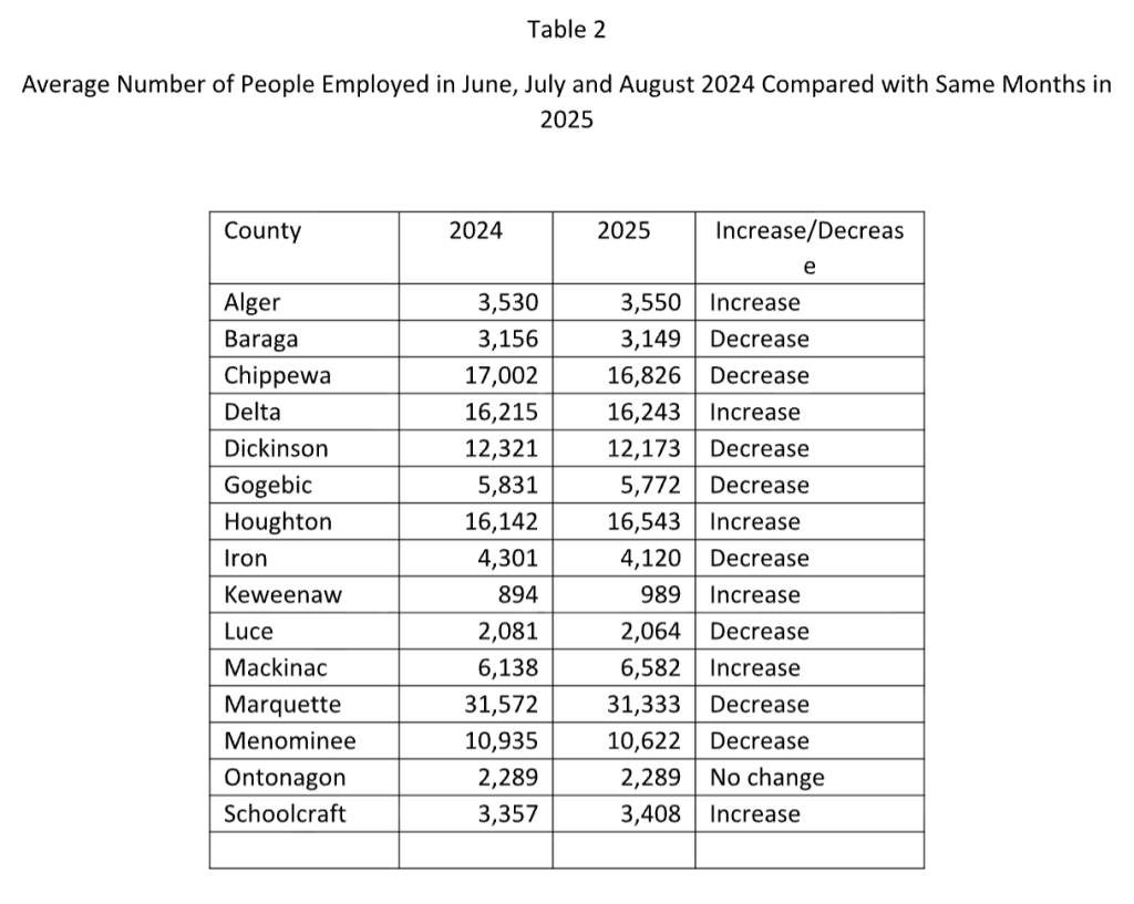 To measure employment growth and control for the seasonality of the recreation economy, average employment for June, July and August in 2024 was compared with the equivalent period in 2025 (Table 2). Eight of the counties experienced a drop in overall employment, while six experienced an increase and there was no change in one county. Particularly notable are the employment gains in the recreation dominated counties of Mackinac (+7%) and Keweenaw (10.6%), while Menominee, a manufacturing county, had the largest percentage drop in employment (-2.9%), which is line with the national trend of job losses in this sector.
