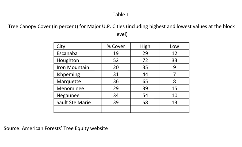Tree cover data are from the American Forests’ Tree Equity website (https://www.treeequityscore.org/). For each city and their census blocks (the smallest geographic unit used by the Census Bureau for tabulation of 100-percent data) the percentage tree cover is calculated using satellite imagery. Houghton has the highest amount of tree cover at 52 percent; Escanaba’s 19 percent figure is the lowest; while half of the cities fall within the 30-39 percent range (Table 1).